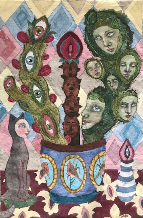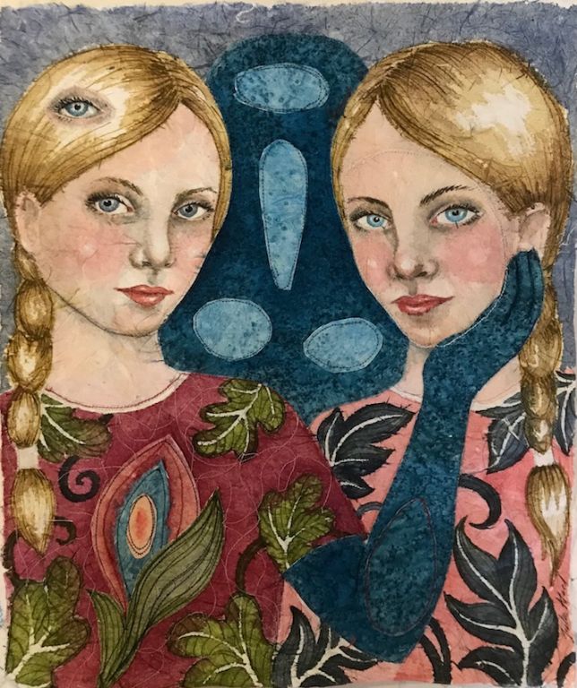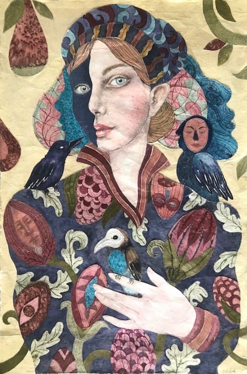 Bird Whisperer 2020, 100x66 cm, syet collage: Akvarel og sytråd på japanpapir