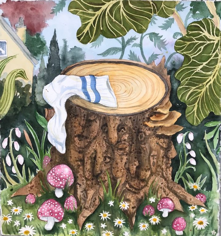 Træstub med strømpe 2020, Akvarel på papir.