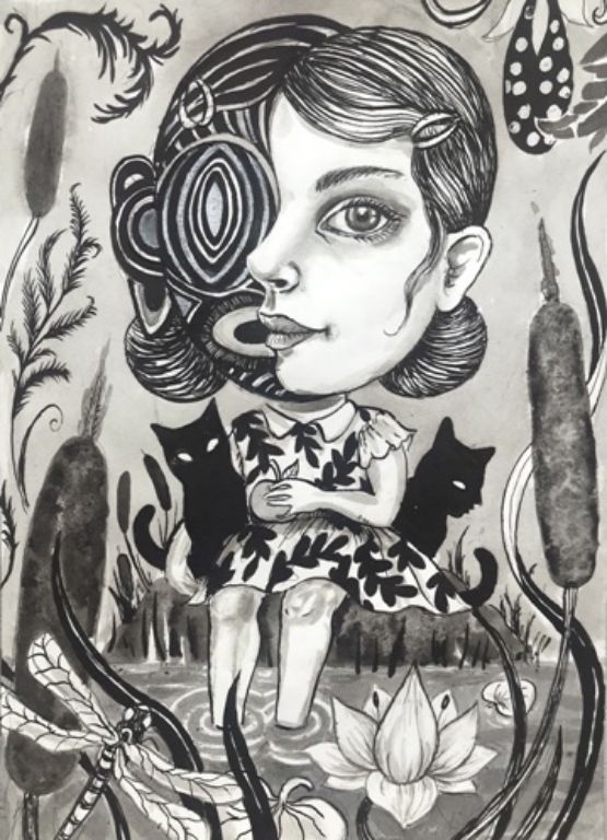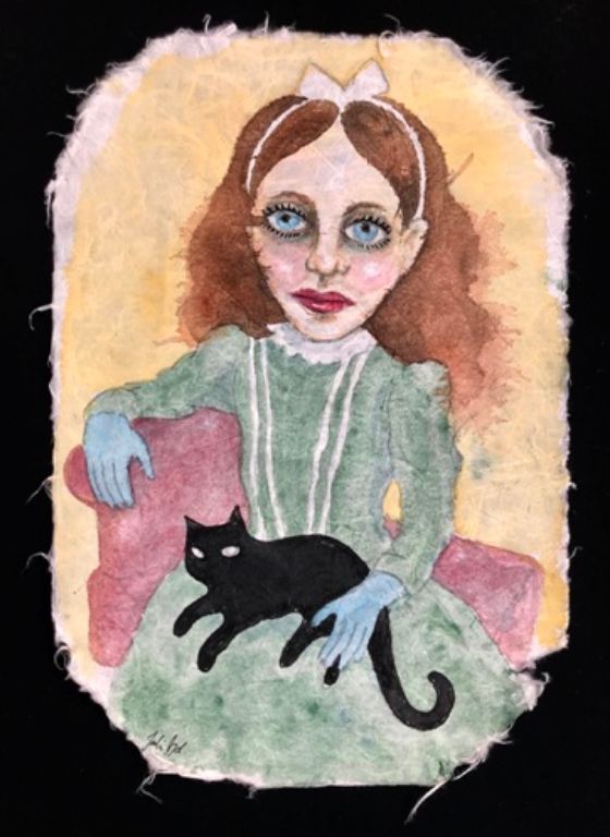 Unknown Girl with cat 30,5x21 cm, Akvarel og tusch på japanpapir, 2019