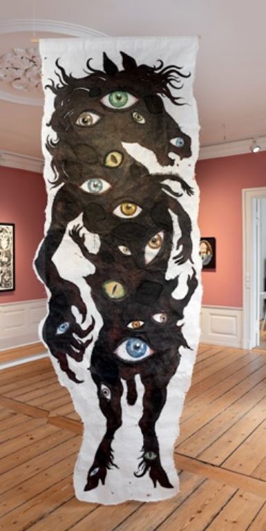 Dark Horse 284x103 cm, Collage. Akvarel, tusch og sytråd på japanpapir, 2019