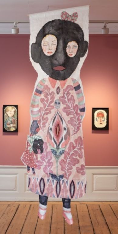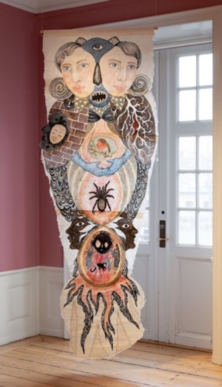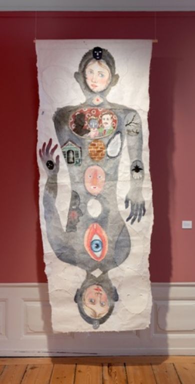 Totem 260x93 cm, Collage. Akvarel, tusch og sytråd på japanpapir, 2019