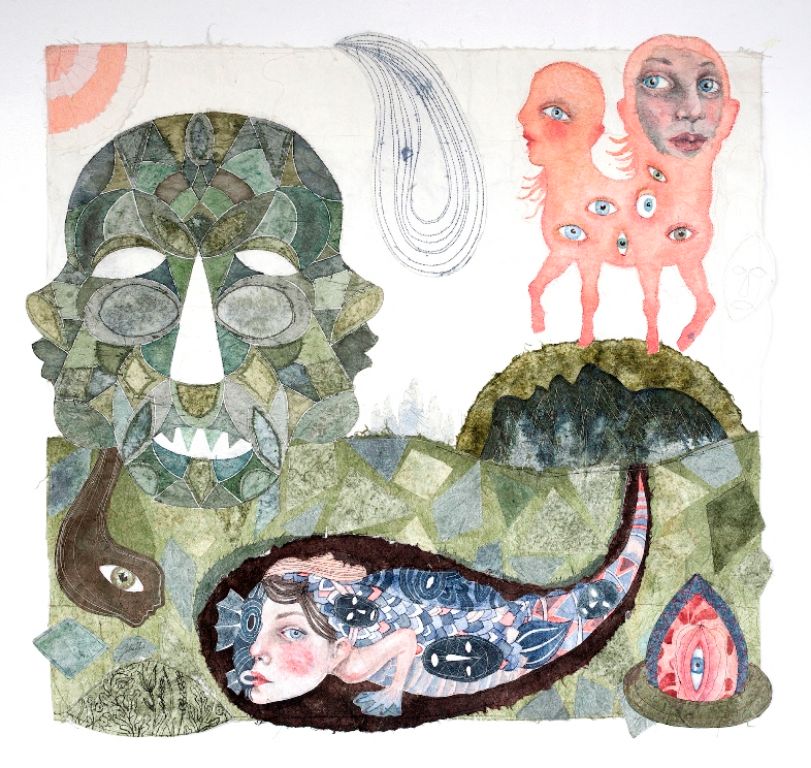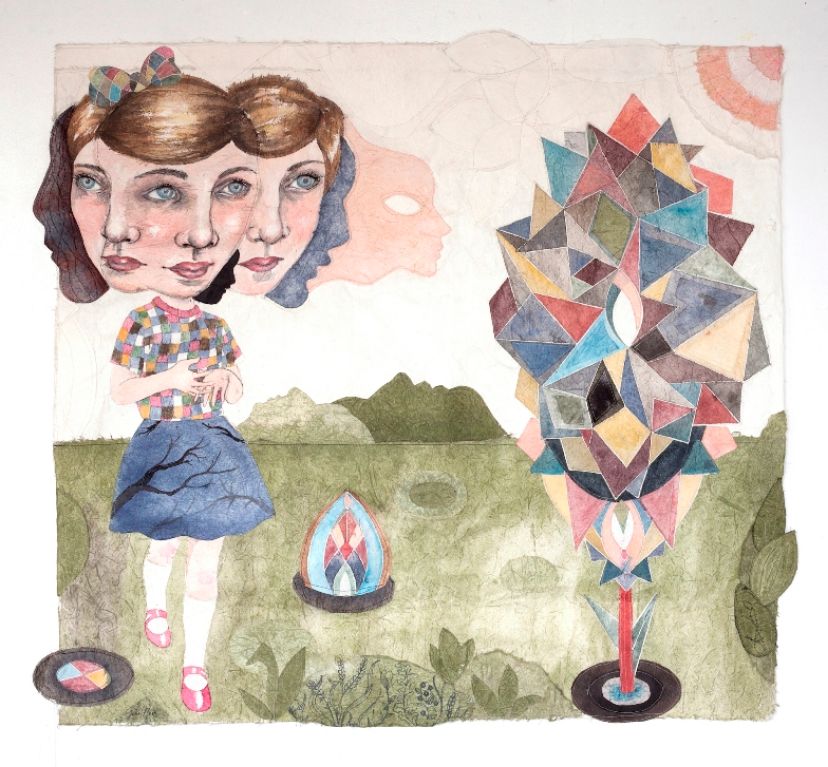 Recurring Dream 305x105 cm, Collage. Akvarel, tusch og sytråd på japanpapir, 2019