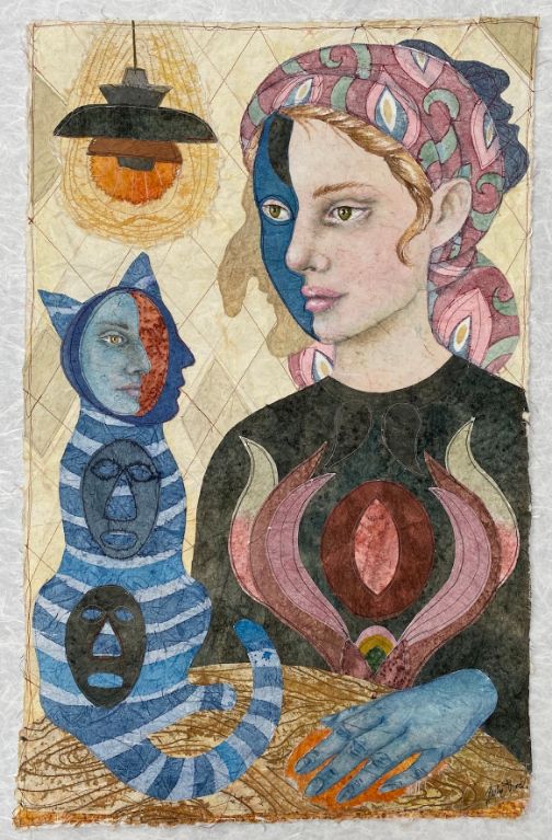 Cat Lady 2021, 80 x 51 cm., Syet papircollage: akvarel, tusch, sytråd, yume papir.