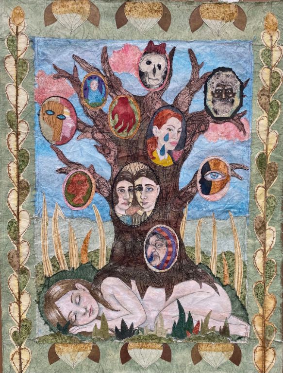 Family Tree 2021, 115x87 cm., Syet papircollage: akvarel, tusch, sytråd, yume papir.