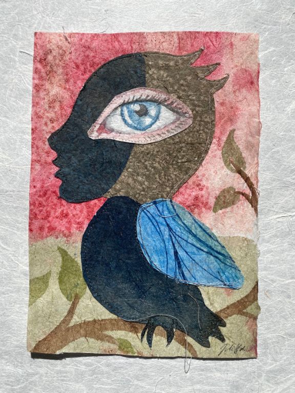 Blue Bird 2021, 21,5x 15,5 cm., Syet papircollage: akvarel, tusch, sytråd, yume papir.