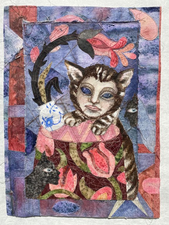 Cats and Flowers 2021, 52 x 39 cm., Syet papircollage: akvarel, tusch, sytråd, yume papir.