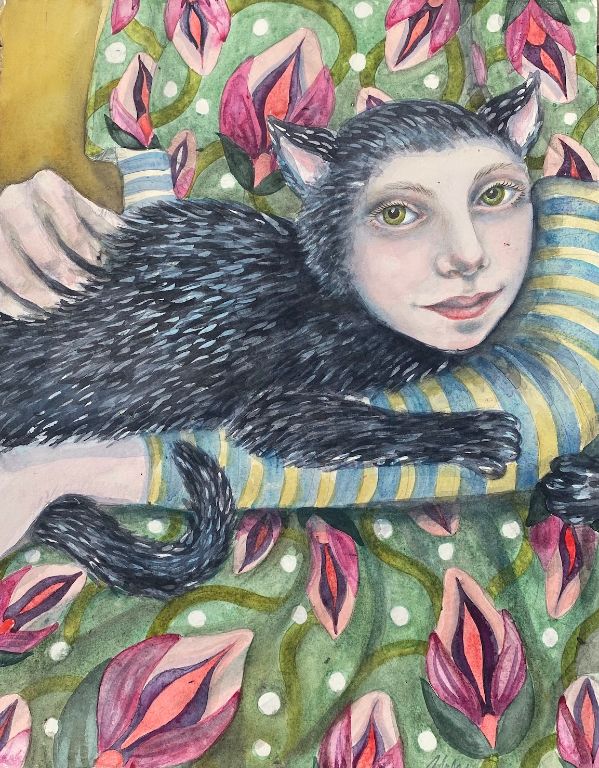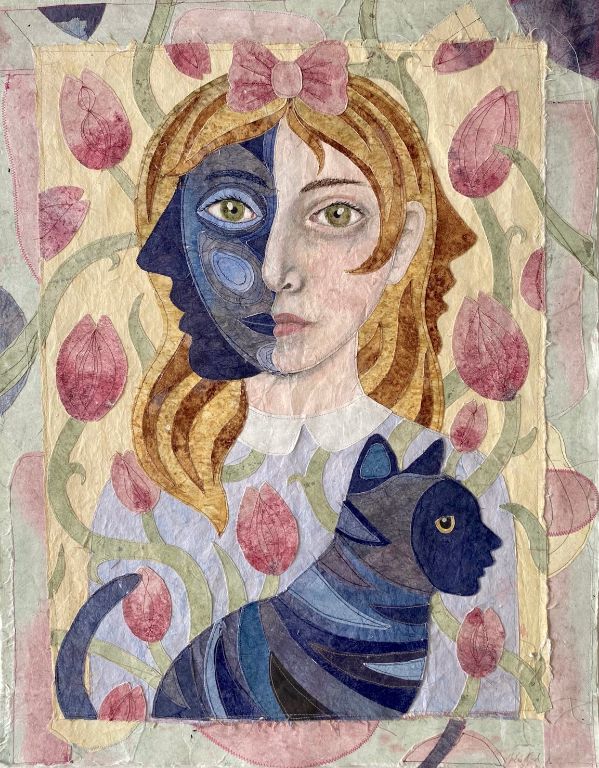 Blue Cat, Pink Tulips 2022, 74 x 59 cm., Akvarel, tusch og sytråd på japansk yume papir.