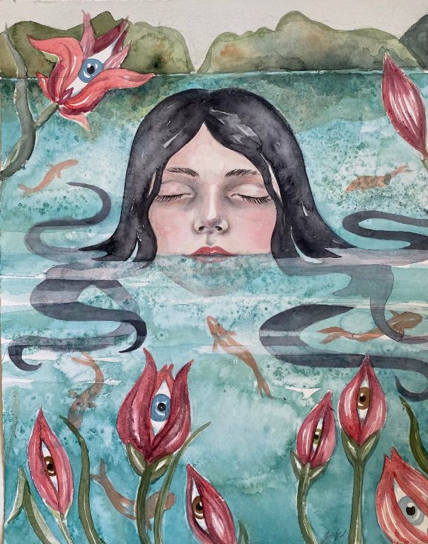 Down by the Water 2022, 48 x 38 cm., Akvarel og tusch på papir.