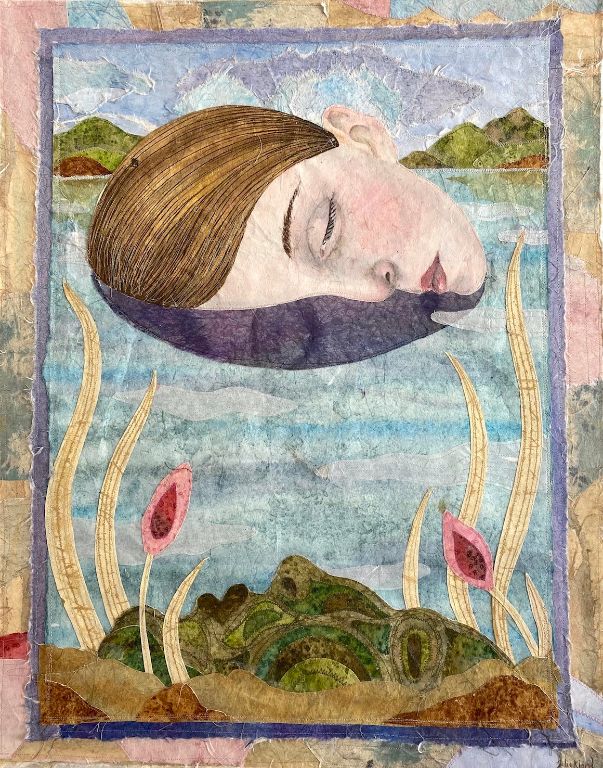 Lake Shore 2022, 74 x 59 cm., Akvarel, tusch og sytråd på japansk yume papir.